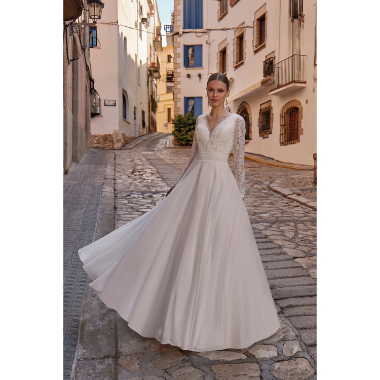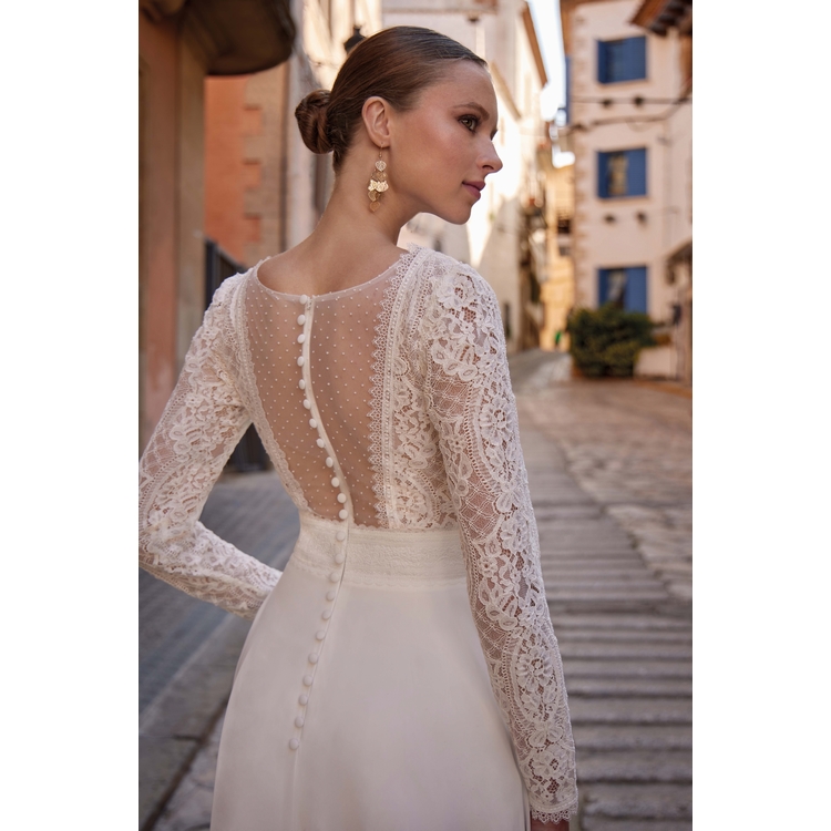 Robe de mariée trapèze en dentelle et mousseline, empiècement dos en plumetis boutonné