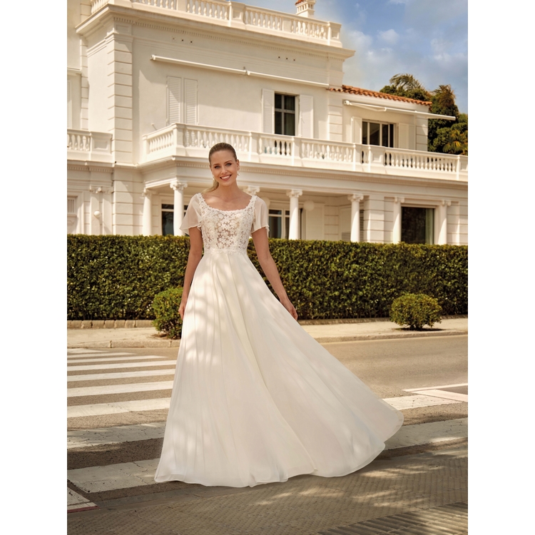 Robe de mariée en guipure et mousseline. Encolure carré et manchettes amovibles.